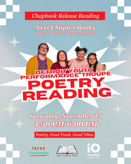 Mark your calendars! InsideOut’s 2025-2026 Detroit Youth Poetry Troupe will give at reading at Next Chapter Books in honor of their upcoming chapbook. This event is free and open to all. Food available for purchase from Tacos Hernandez.